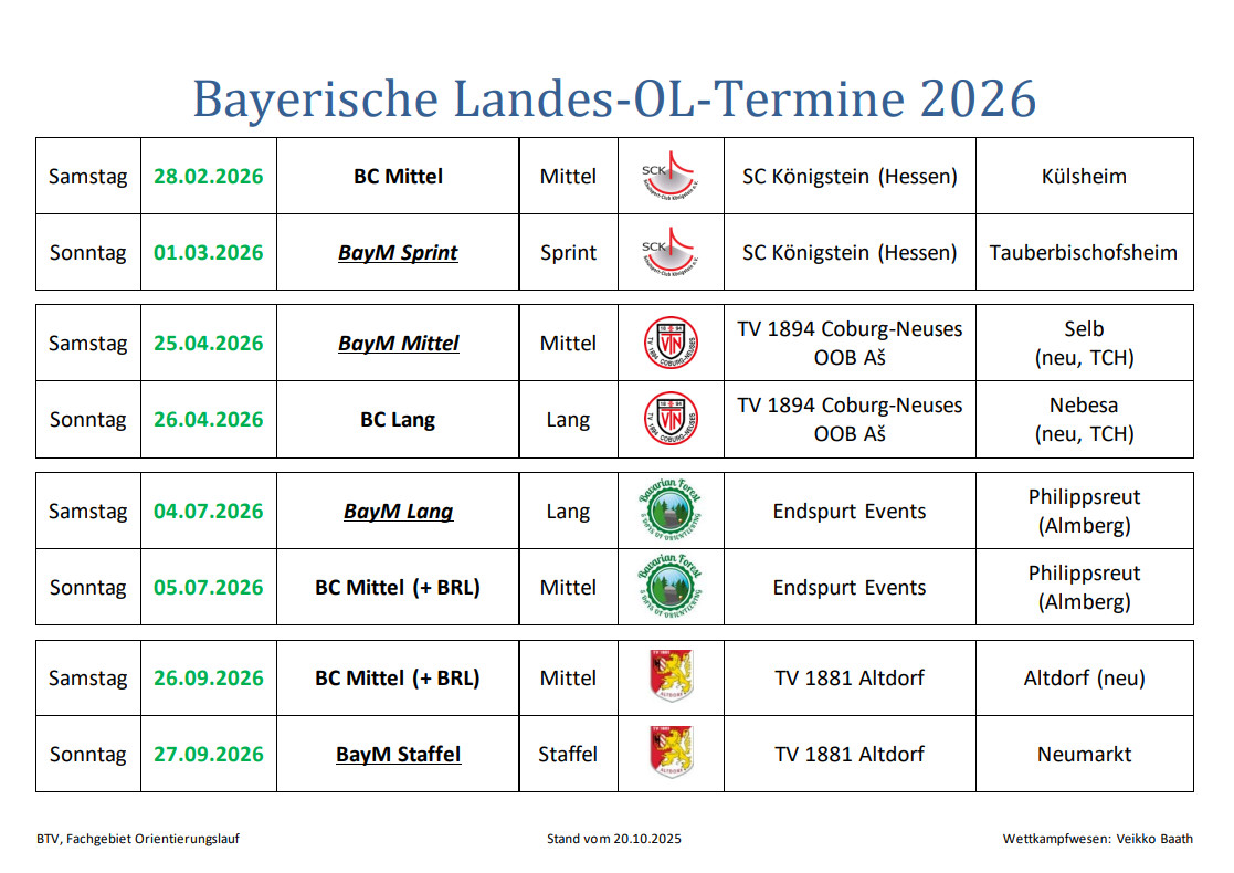 Abschluss der Landessaison ist Ende September mit dem 7. BayernCup-Lauf über die Mitteldistanz in Altdorf. Auch dieser Lauf wird als BRL mitgewertet. Saisonabschluss ist die Bayerische Staffelmeisterschaft in Neumarkt/Opf. Beide Läufe werden vom TV 1881 Altdorf ausgerichtet.