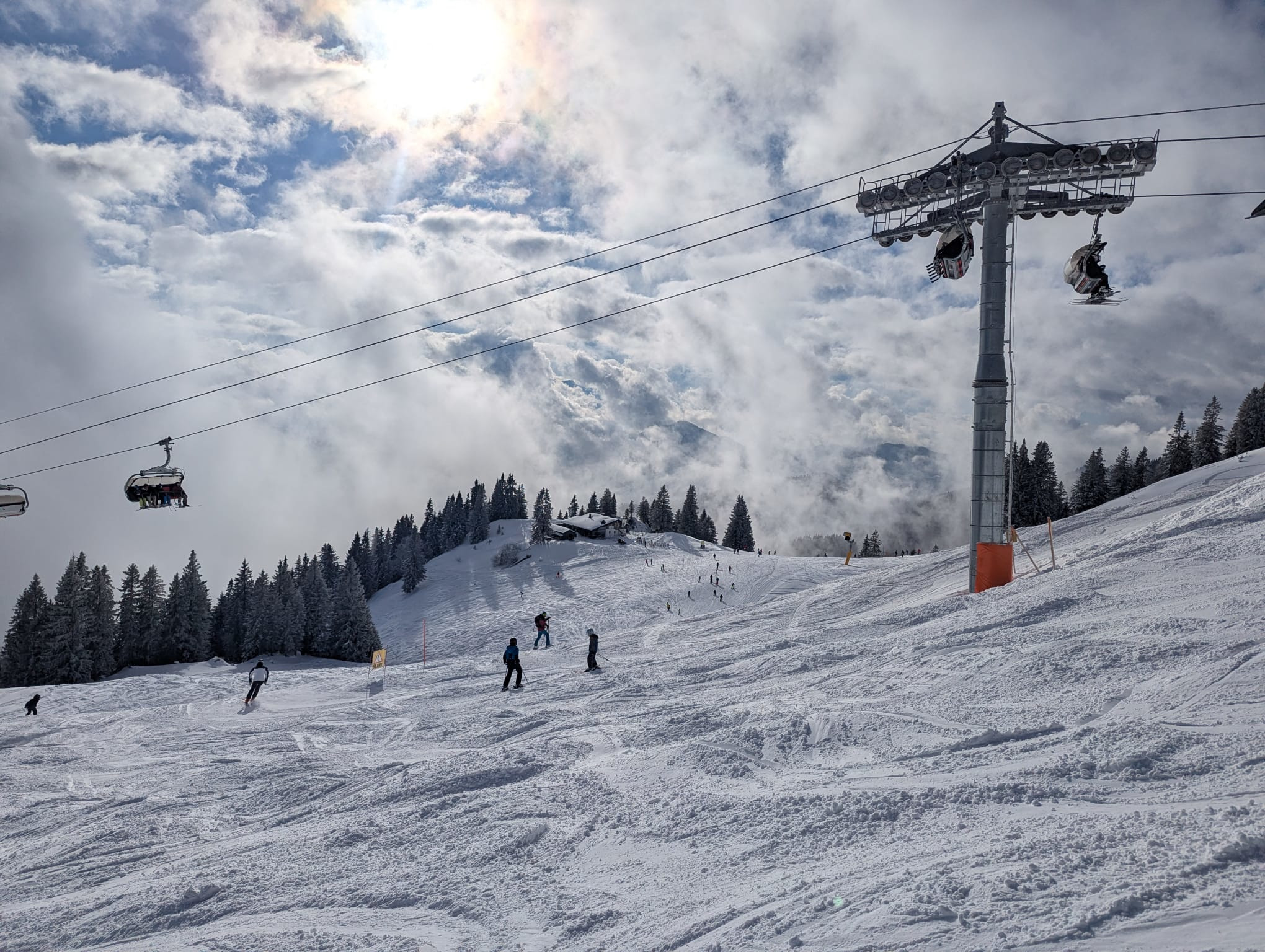 Auch am Sonntag starteten, wir wieder zur gewohnten Zeit. In der Früh hatte es erneut geschneit, so dass die Pisten zunächst schön frisch, im Laufe des Tages jedoch recht hügelig wurden. Das machte das fahren etwas anspruchsvoller, wurde aber durch die Sonne, die sich im Laufe des Tages zeigte mehr als ausgeglichen. Zum Mittagessen trafen wir uns erneut auf der Tölzer Hütte. Diesmal gab es Kaiserschmarren.